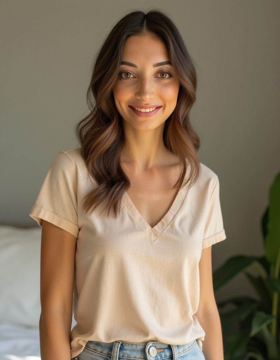 Botulinumtoxin plus Skinbooster, feindosierter Volumenaufbau (z. B. hyaluronbasiert) zur sanften Konturharmonisierung – je nach Befund.